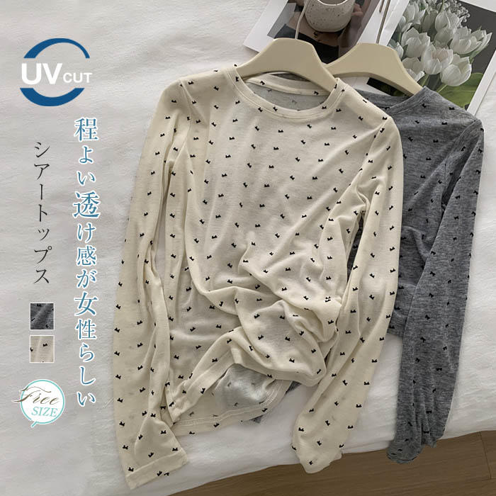シアーロングスリーブTシャツ 長袖tシャツ レディース 春夏 夏 ドット柄 透け感 こなれ感 清楚 肌見せ セレブ 清涼感 抜け感 お洒落 可愛い 重ね着 レイヤード シアーブラウス