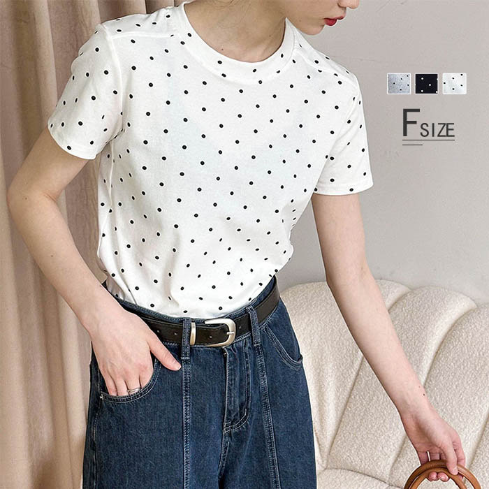 ドット柄 tシャツ 半袖 tシャツ レディース 半袖 綿 カジュアル tシャツ レディース おしゃれ カットソー レディース クルーネック 小さめドット 水玉 可愛い 春 夏 ゆったり 白 黒