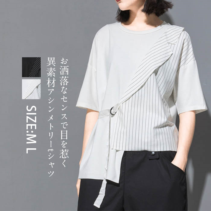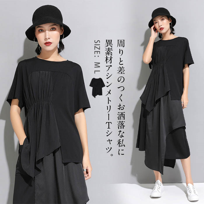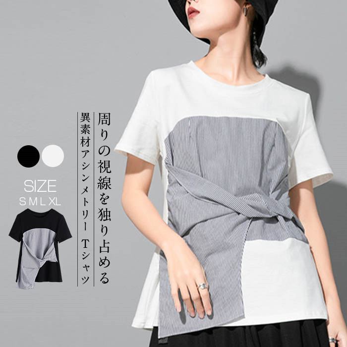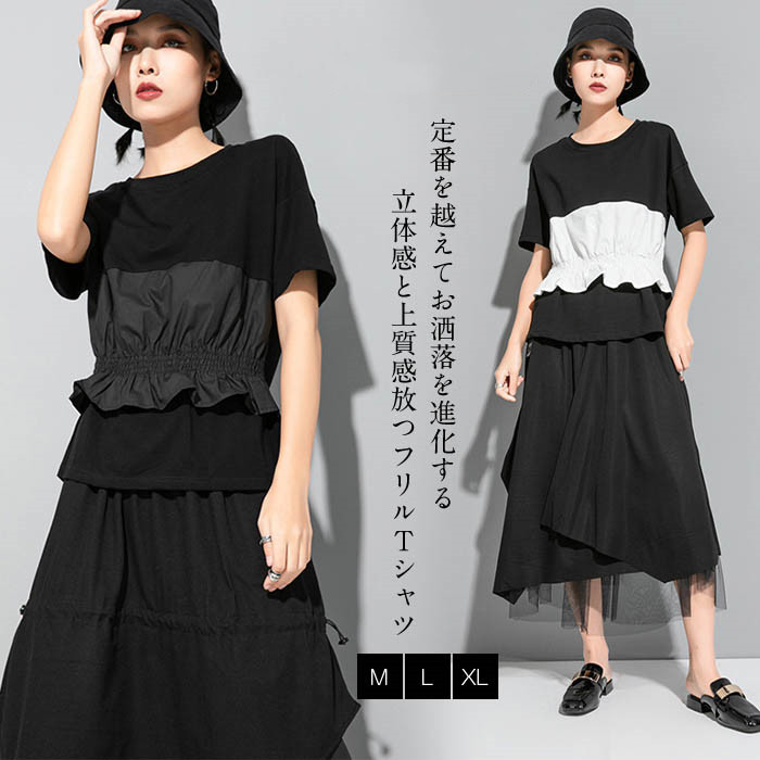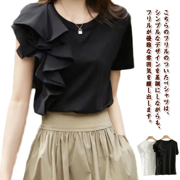 女性 Tシャツ アシンメトリー アシメ カットソー ホワイト フリル トップス 20代 大きいサイズ 白 黒 二の腕華見え 半袖 ブラック 30代 40代 50代 ラウンドネック