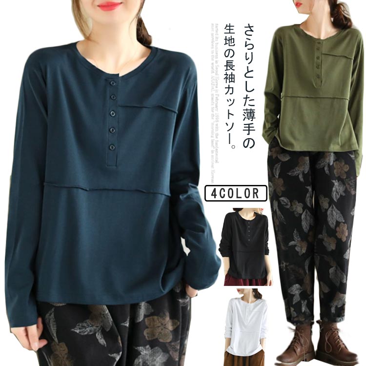 カットソー シャツ レディース 長袖 トップス クルーネック ボタン シャツレディースファッション トップス シャツ カットソー