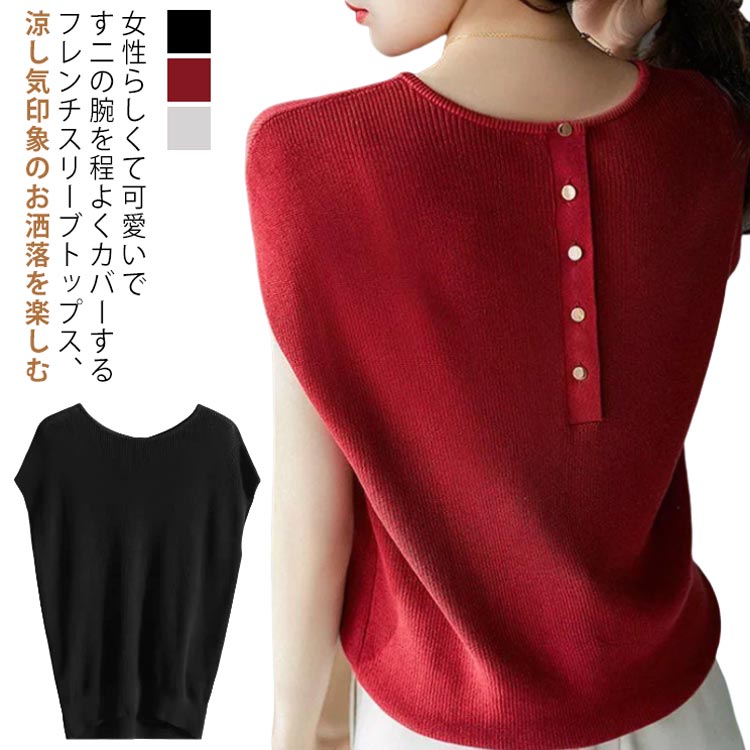 冷感 カットソー 半袖 サマー 接触冷感 フレンチスリーブ ブラック 夏用 薄手 ニット バックボタン飾り 丸首 クルーネック ゆったり ワインレッド グレー レディース