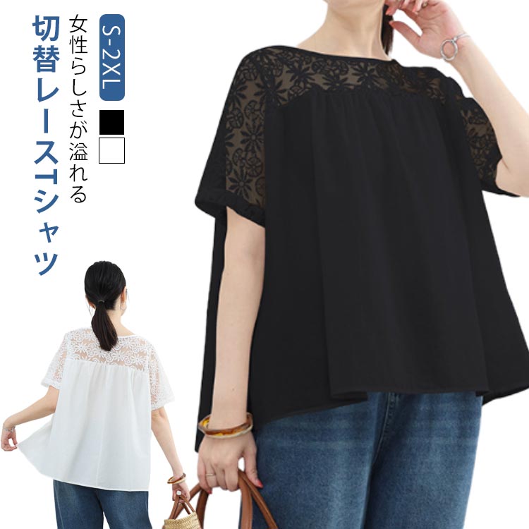 無地 黒 レース切り替え 異素材ミックス ホワイト ゆったり 半袖 リラックス 韓国 シャツ 白 ブラック 30代 白シャツ レディース 透け感 女性 20代 40代 黒シャツ