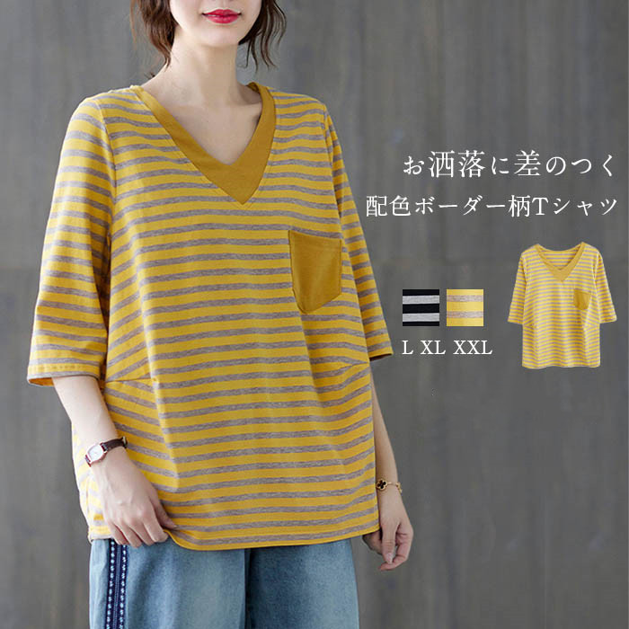 ボーダー tシャツ カットソー 半袖 レディース 春 夏 tシャツ レディース 半袖 大きいサイズ 配色 tシャツ レディース 20代 30代 40代 vネック ゆったり