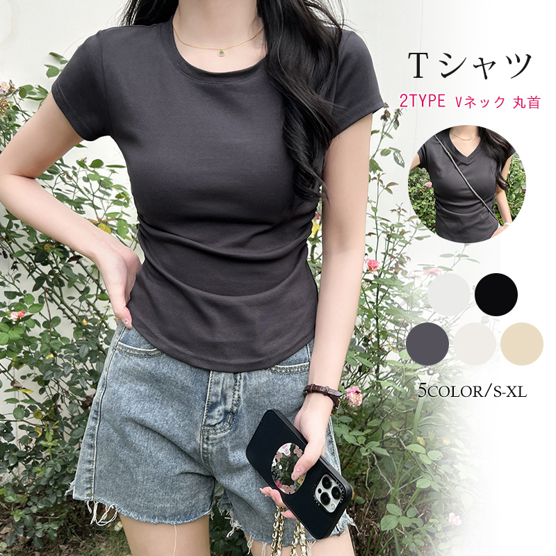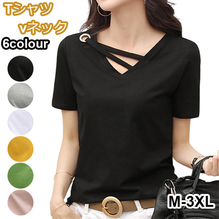Tシャツ レディース 半袖 vネック デザイン アシンメトリー 無地 アシメカットソー シンプル カットソー アシメカット 夏 秋 M-3XL