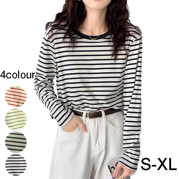 ボーダー Tシャツ レディース 綿 ロンT カットソー 長袖 丸首 ゆったり おしゃれ カジュアル トップス 春秋 S-XL