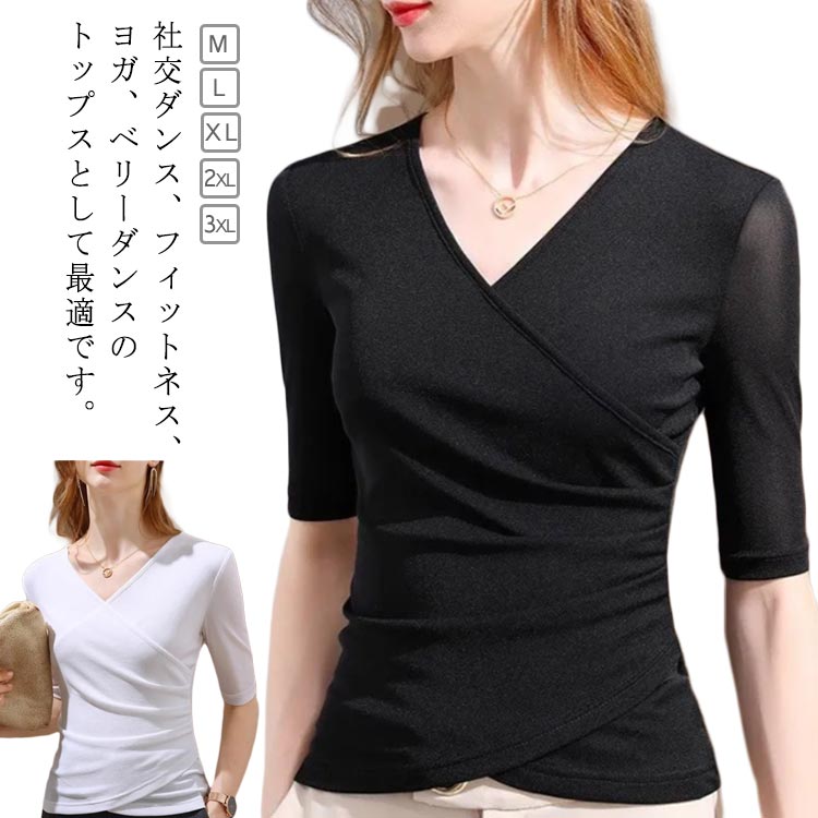 ダンス 五分袖 Tシャツ 交差するVネック シースルー 五分袖 トップス レディースレディースファッション トップス Tシャツ カットソー