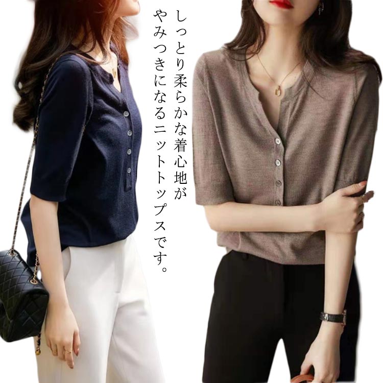 ボタン トップス 五分袖 レディース レディース きれいめ カットソー プルオーバー ニットレディースファッション トップス シャツ カットソー