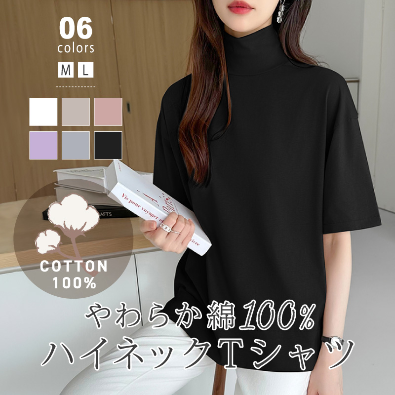 6冠達成/ コットン100%で優しく柔らかな肌触り ハイネックTシャツ コットンT 綿100Tシャツ コットンtシャツ 白t 黒t 半袖カットソー 袖長め 二の腕カバー