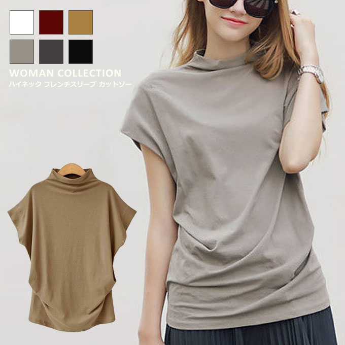 カットソー 半袖 レディース ボトルネック ドレープ 大きいサイズ 夏 半袖 コットン 赤 トップス おしゃれ 白 黒 オフィス グレー シンプル ブラック 春夏