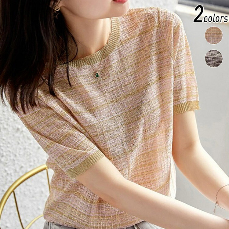 新作 チェック柄 半袖 ニットトップス レディース 気質 エレガント スリム 着痩せ 若見え Tシャツ