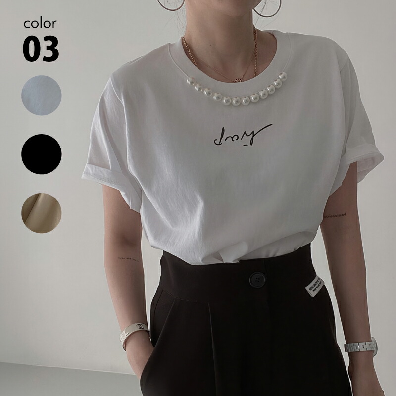 きれいめ パールデザイン おしゃれ ロゴ シャツ レディース 半袖 ロゴ プリント ブラック ホワイト [春 夏 ラウンドネック インナー ウェア カットソー トップス 大人 可愛い コーデ 半袖