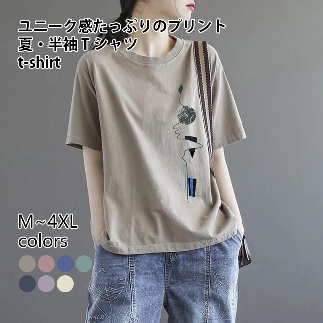 Tシャツ レディース 半袖Tシャツ クルーネック ゆったり 夏 tシャツ カットソー トップス Tシャツ 半袖 プリントTシャツ イラスト 夏Tシャツ シンプル 丸首 ベージュ ピンク ネイビー サマ