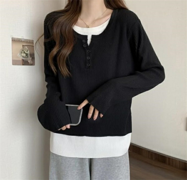 トレーナー レディース トップス 深ネック 長袖 重ね着風 コットン カットソー ゆったり 無地 綿 柔らかい オシャレ 着痩せ 体型カバー 春秋冬