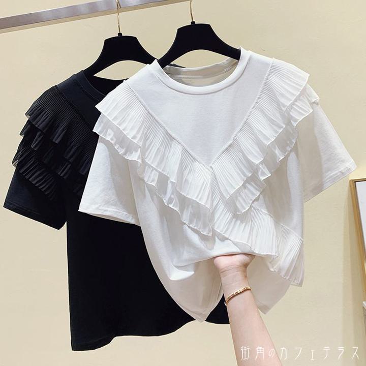 レディース トップス カットソー クルーネック フリル アシンメトリー こなれ感 大人かわいい シンプル カジュアル キュート 体型カバー 半袖 ホワイト ブラック 白 黒 20代 30代 40代 通