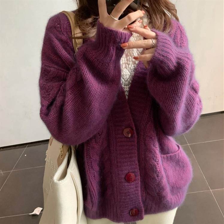 カーディガン レディース トップス 2 パープル 紫 イエロー 黄色 ブルー 青 コーヒー 茶色 無地 大人カラー 秋カラー くすみカラー ニット ネック ポケット 個性的
