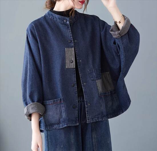 ジャケット アウター デニムジャケット カーディガン レディース ツーリングジャケット 襟なし 長袖 無地 切り替えデザイン バイカラー 春 秋 ショート丈 前開き シングルブレスト