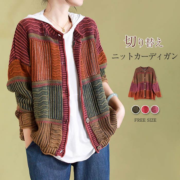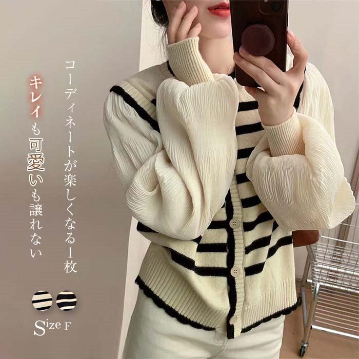 カーディガン レディース トップス ニット ニットガーディガン 春 秋 春秋 長袖 長袖ニット レディースニット ボーダー ドッキング クールネック