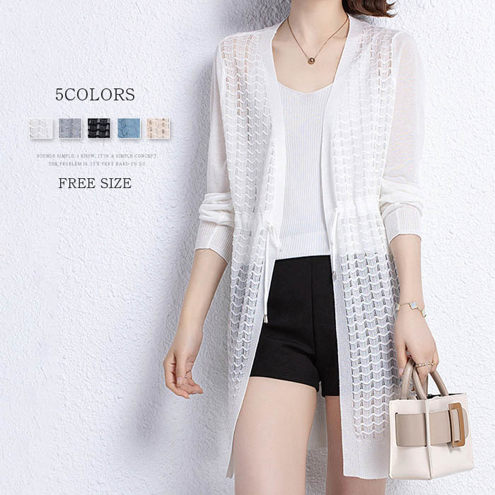 カーディガン レディース 長袖 薄手 シアー 夏 透かし編み ロングカーディガン 春 夏 ニット 羽織り リポン ロング丈