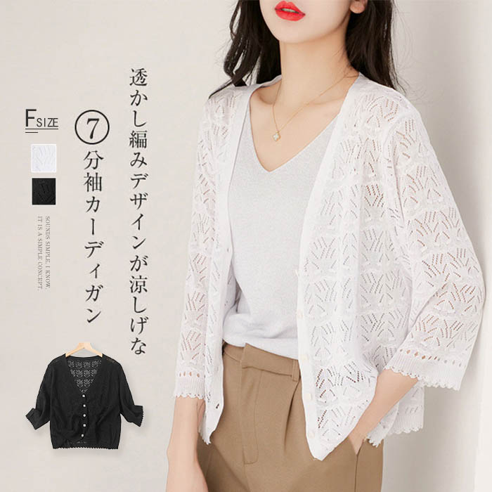 透かし編みがフェミニンな雰囲気漂うカーディガン 透かし編みカーディガン レディース 薄手 夏 透かし 羽織り 七分袖 おしゃれ シンプル ネック 白 ホワイト 黒 ブラック