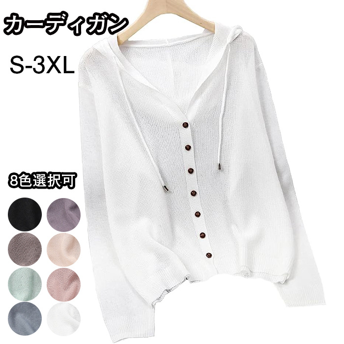 カーディガン 羽織り レディース ニット 透かし編み 薄手 長袖 ショート丈 フード付き 無地 春夏 カジュアル M-3XL