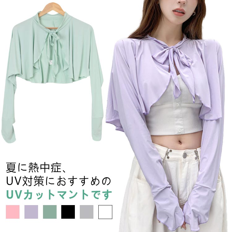 ケープ 接触冷感 指穴付き 着る日焼け止め ボレロタイプ ケープ 羽織り 手袋 カット リボン フリル 前後差 ストレッチ ひんやり 涼しい 紫外線 対策 ボレロ型