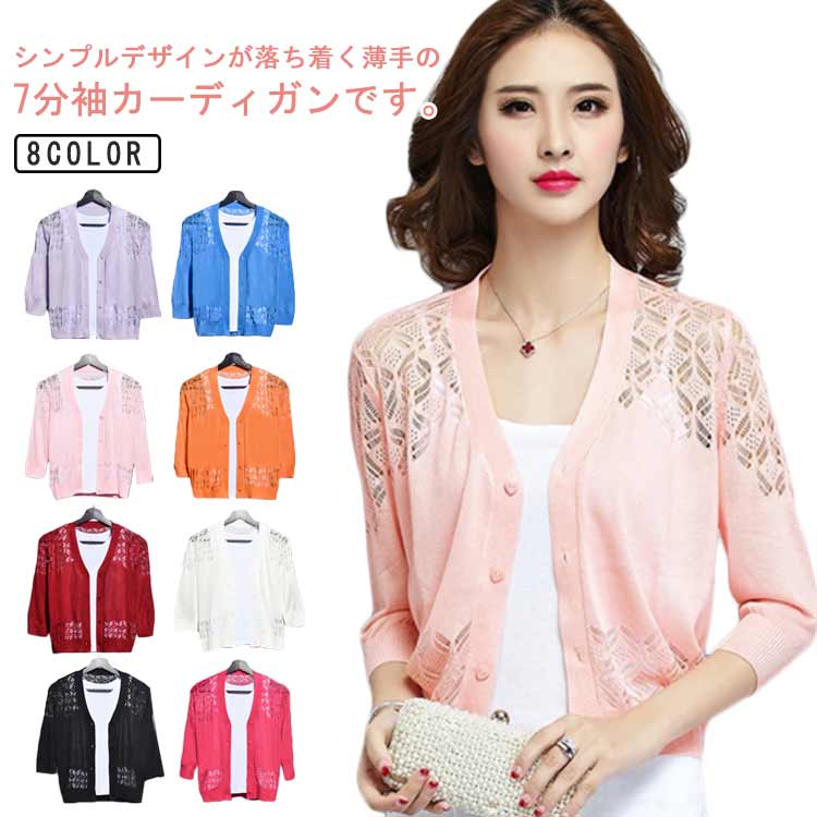 サマー レディース カーディガン 夏 透かし編み トップス ショート丈 羽織り 七分袖 春レディースファッション トップス カーディガン ボレロ