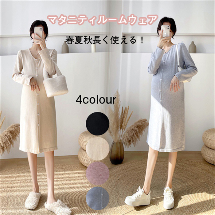マタニティルームウェア パジャマ カーディガン パジャマ ニットワンピース マタニティウエア 授乳服 275日パジャマ ボタン開きワンピースパジャマ 産前 産後 春夏秋 -