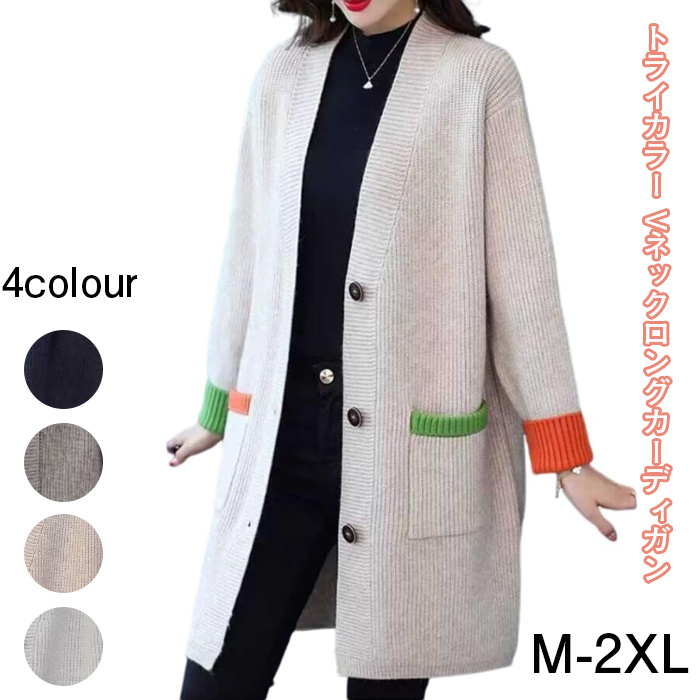 トライカラー ニット カーディガン レディース ロング ポケット付き 秋 冬 Vネック トップス 秋冬 セーター ニット長袖 柔らかい ゆったり 暖か オシャレ 大人 カジュアル 通勤 秋 冬
