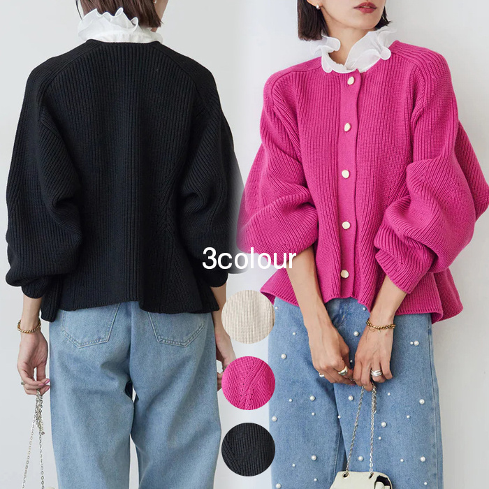 4色展開 カーディガン レディース クルーネック セーター ニット 長袖 ボリューム袖 無地 春 秋 冬 オフホワイト イエロー グレー カーキグリーン フリーサイズ