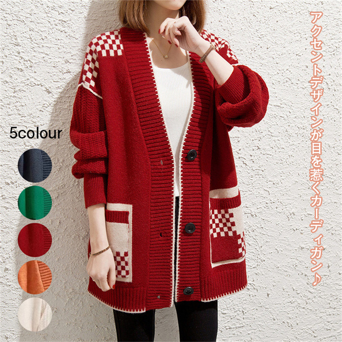 5色展開 カーディガン チェック柄 レディース アウター 長袖 セーター トップス 秋 冬 ネイビー オレンジ グリーン ワインレッド オフホワイト フリーサイズ
