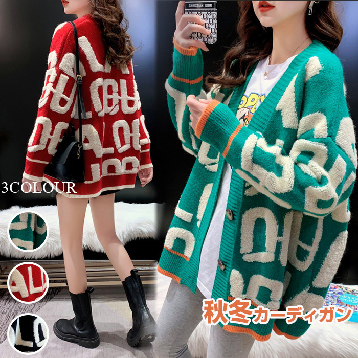 配色アルファベット カーディガン レディース 秋冬 ニットカーディガン 羽織り ゆったり 体型カバー 長袖 コーディガン 春 秋冬 カーディガン もこもこ あったか ニット カーデガン