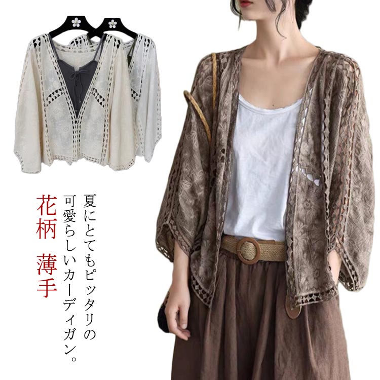 かぎ針編み サマーカーディガン レディース かわいい 韓国風 透かしトップス 薄手 Vネック サマーニットトップス 花柄 前開き透け感ニット 肌見せカーディガン 着やせ 半袖羽織り