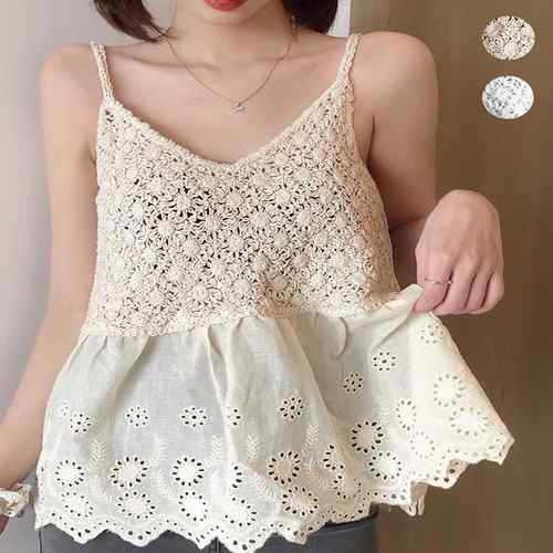 レディース クロシェ編みニットキャミ 切り替え ノースリーブ サマーコーデ 肌見せ 大人可愛い カジュアル 薄手トップス 体型カバーキャミ セクシートップス 透け感サマーニット