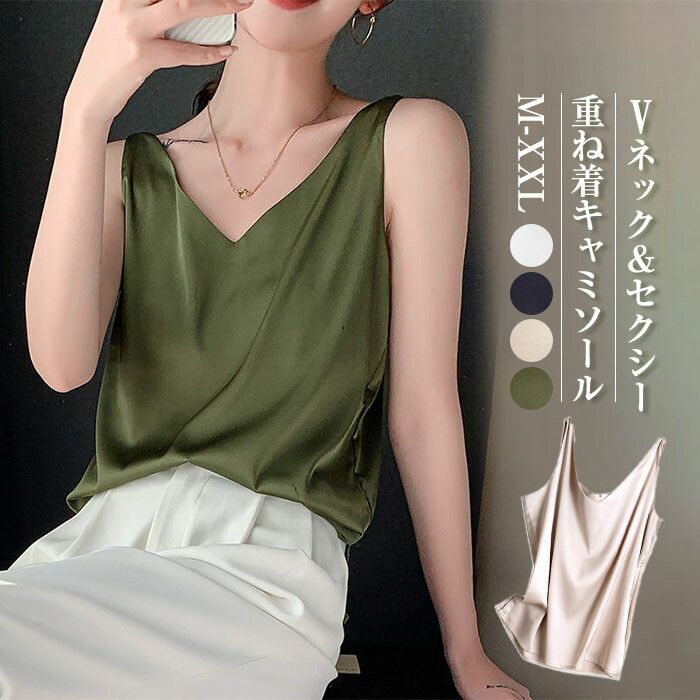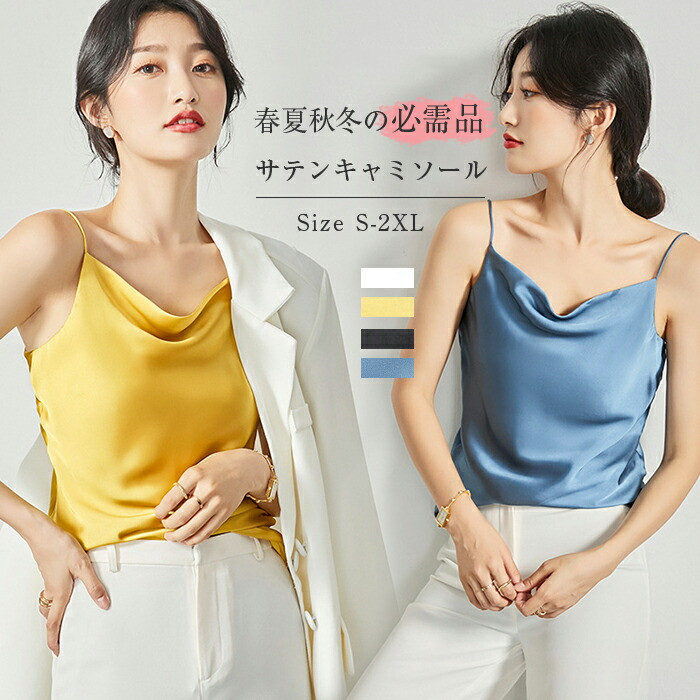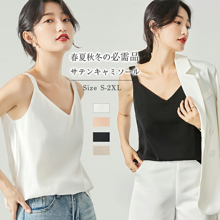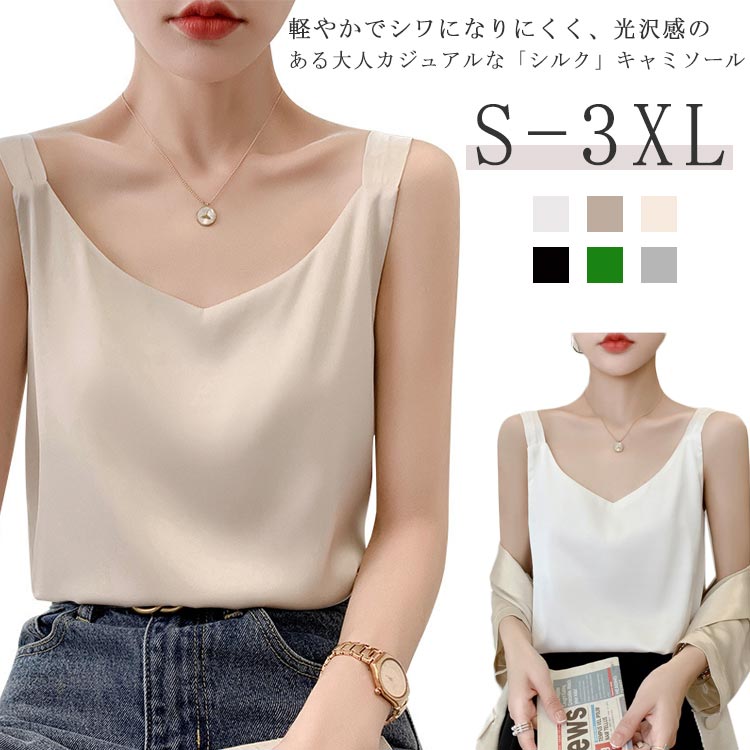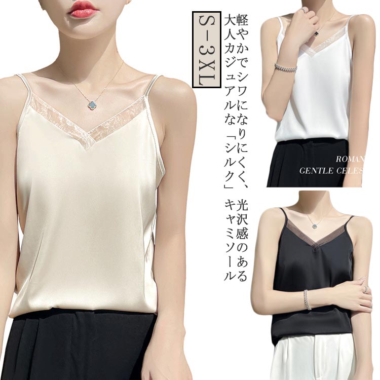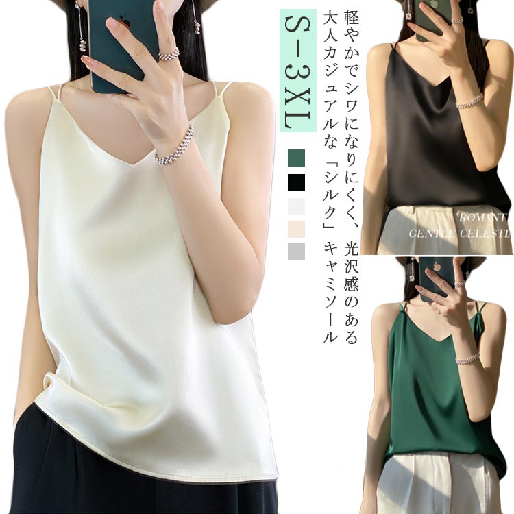 サテン調 シルク シルク混 タンク トップ 快適 夏用 シルク 通勤 光沢 きれいめ 黒 白 20代 30代 キャミソール