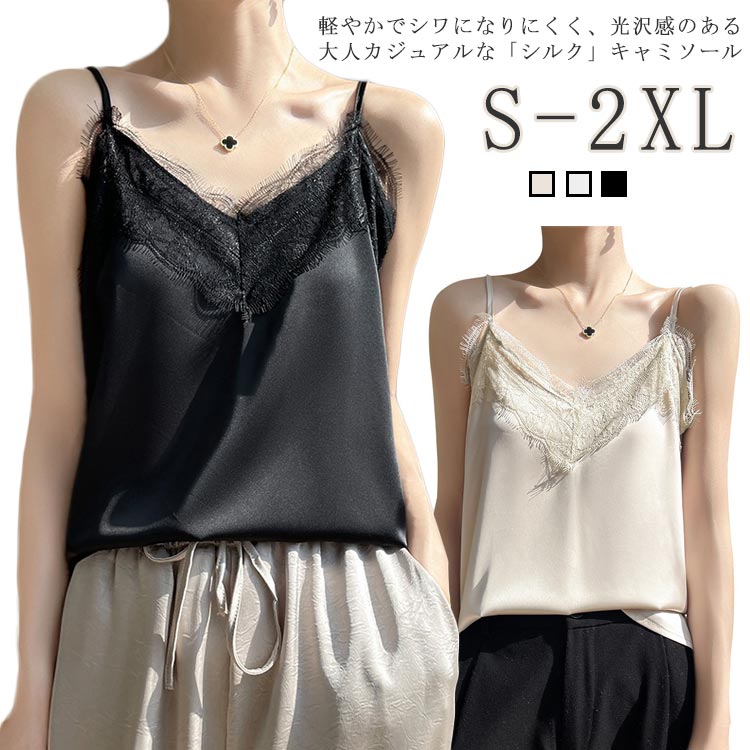 きれいめ シルク キャミソール キャミソール サテン調 シルク混 レディース キャミ 光沢 夏用 インナータンクトップ 通勤 おしゃれ 快適 黒 白 20代 30代 つるつる