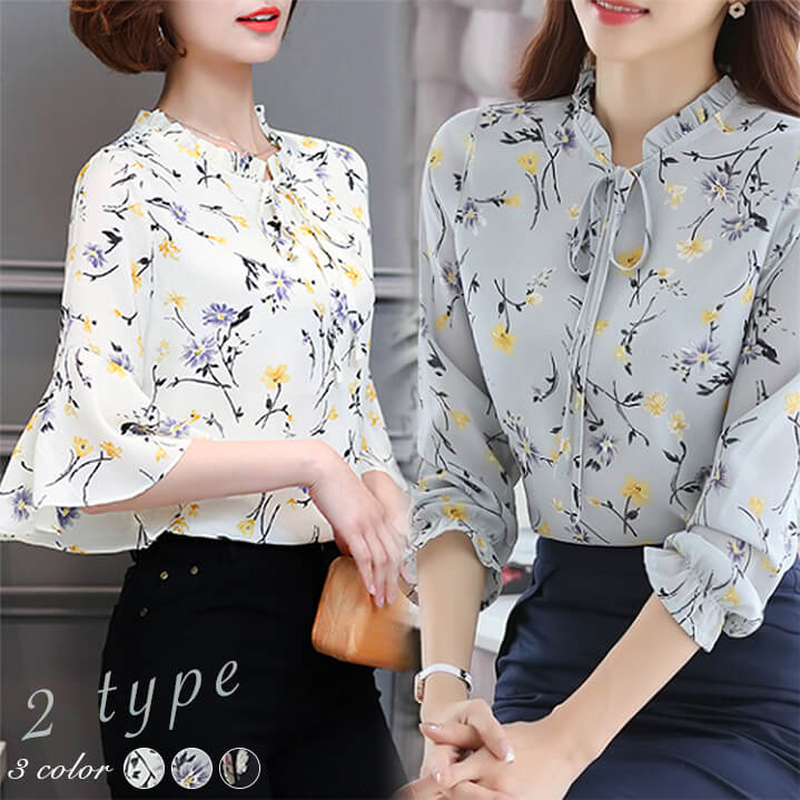 23 花柄シフォンブラウス レディース 半袖 長袖 シフォン ブラウス フレアスリーブ フレア袖 リボン 半袖 チュニック ボタニカル