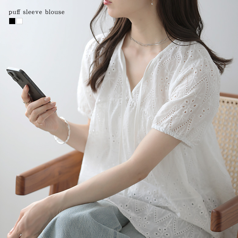 パフスリーブ 半袖 シャツ レース トップス 透け感 ホワイト 白レディースファッション トップス シャツ ブラウス