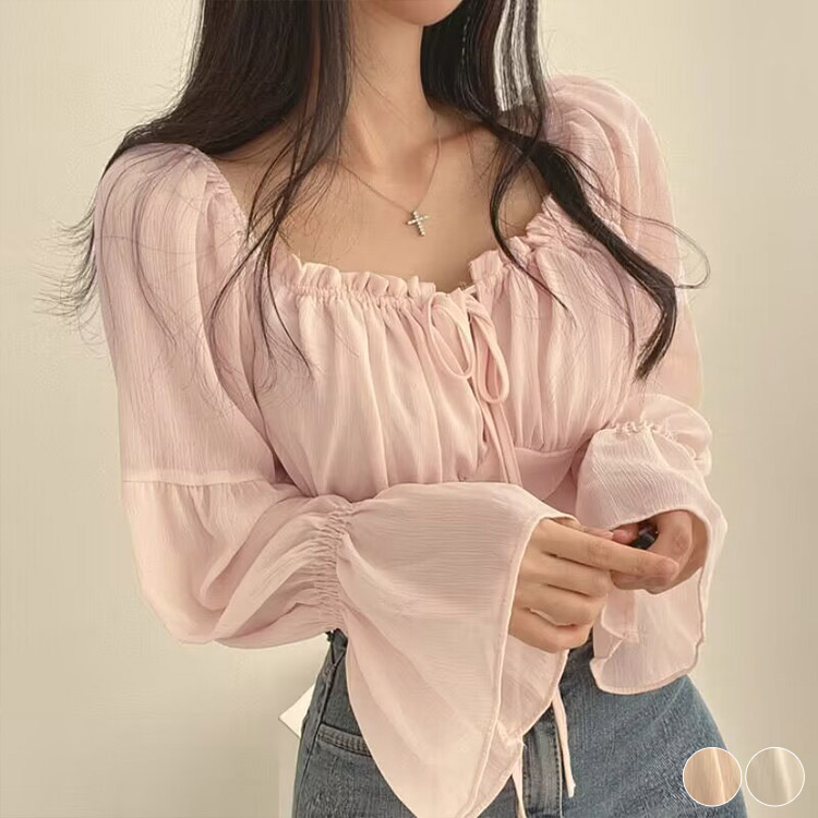 ブラウス レディース シフォン フリル リボン シースルー シアーブラウス 春夏 春 夏 白 長袖 ピンク スクエアネック かわいい 韓国 ショート丈 ベルスリーブ おしゃれ きれいめ 無地 フェミニ