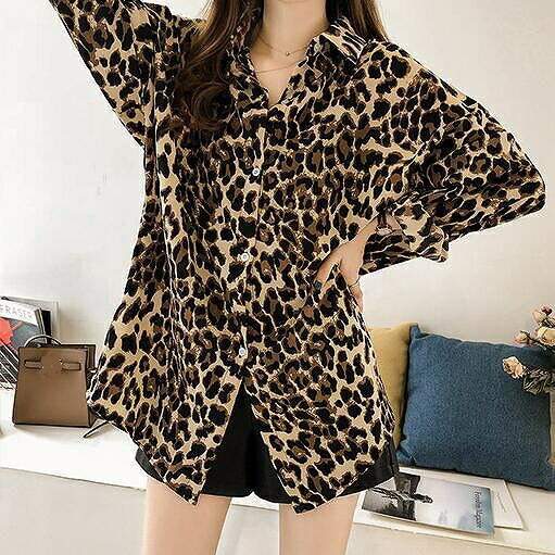 レディース ブラウス ヒョウ柄 ロングシャツ 長袖 トップス カジュアル キュート フェミニン オフコーデ OFF ファンキー クール お出かけ服 オフィス デート M L XL 2XL