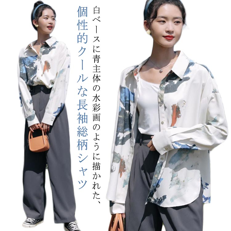 水彩画風 総柄シャツ 長袖 ブラウス レディース シャツ 長袖 ゆったり レトロレディースファッション トップス シャツ ブラウス