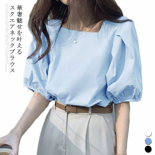 トップス ブラウス レディース 半袖 スクエアネック シャツ パフスリーブ パフ袖 半袖 五分袖 5分袖 ボリューム袖 ぽわん袖