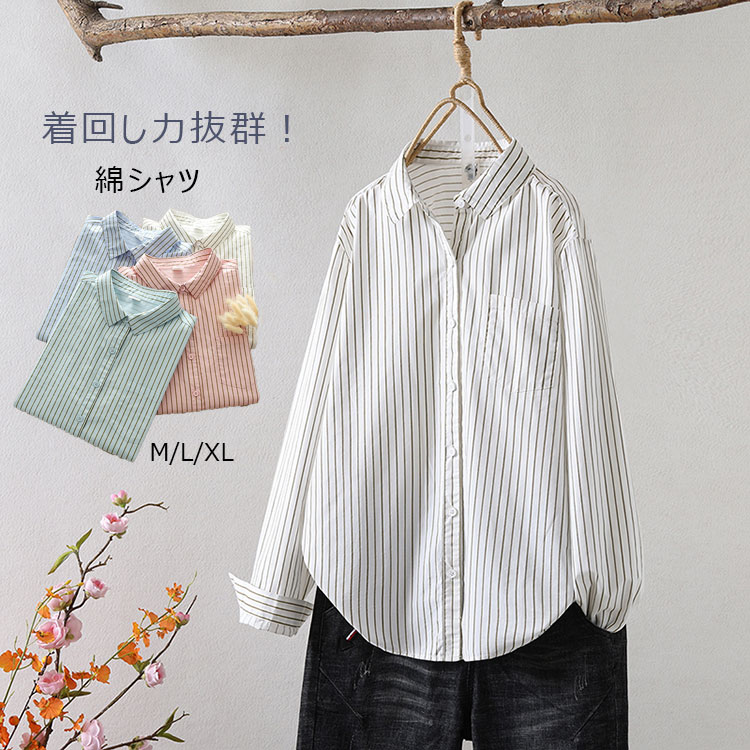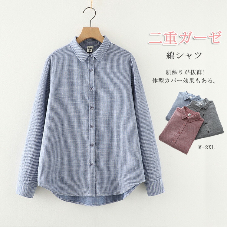 ガーゼ 上品 着回し 長袖シャツ ストライプシャツ 長そで ゆったり シャツ 体型カバー シンプル ブルー レッド ダークグレー M L 前開き