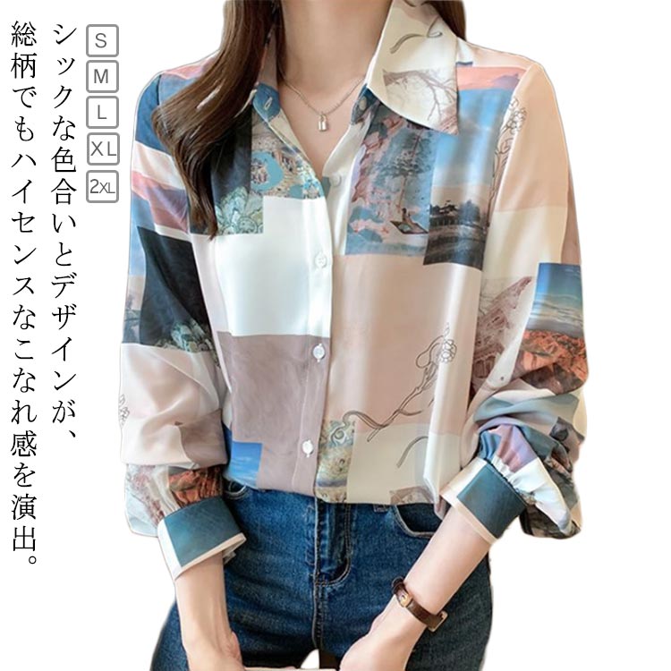 レトロ シャツ ブラウス レディース 長袖 春秋 トップス カットソー 総柄 柄シャツ 薄手 きれいめ ゆったり ボタン 前開き フロントボタン