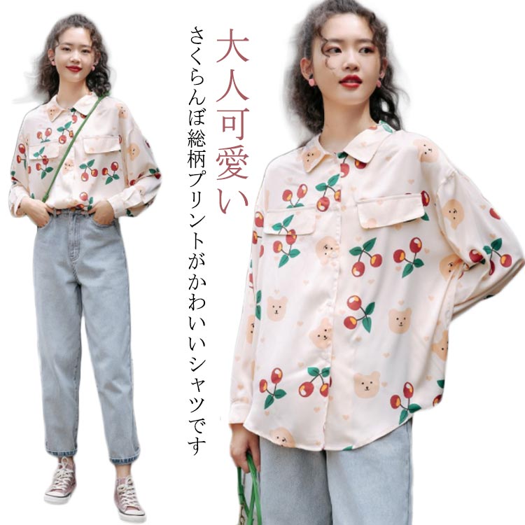 ブラウス シャツ レディース 長袖 秋 チェリー チェリー柄 総柄 柄シャツ 大人可愛い きれいめ レトロ おしゃれ 大きいサイズ