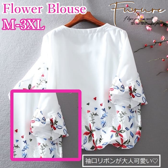 きれいめレディースファッション 韓国ファッション レディース 大きいサイズ M L XL 2XL 3XL トップス ブラウス シャツ チュニック 花柄 刺しゅう フラワー 袖リボン りぼん 袖コンシャ