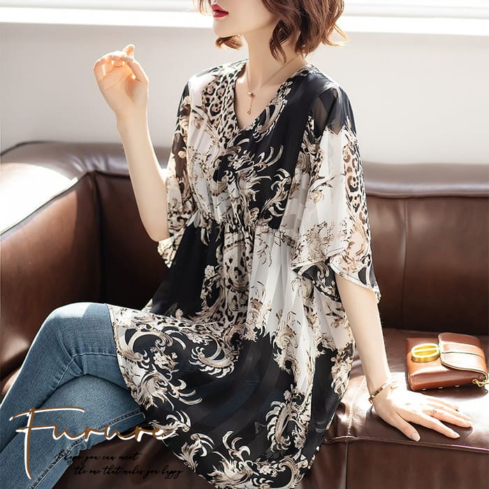 Vネック ウエストマーク 体型カバー 大人カジュアル 細見え 着痩せ 30代 40代 50代 シャーリング入り チュニックトップス アニマル柄 おおぶり 派手目