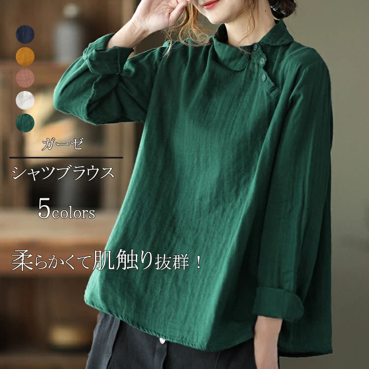 襟デザイン可愛い長袖綿シャツ ガーゼシャツ 長袖シャツ ブラウス タッチ感の優れる素材 柔らかい カジュアル シンプル ナチュラル 落ち着き 肌触りいい 30代 40代 50代 デザイン