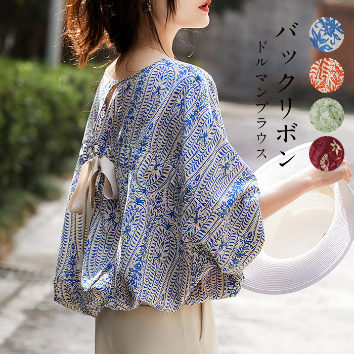 バックリボンづきおしゃれ半袖ドルマンブラウス 半袖シャツ 半袖トップス 裾ゴム 花柄プリント プルオーバー ゆったり きれいめ おしゃれ カジュアル デザイン フリーサイズ