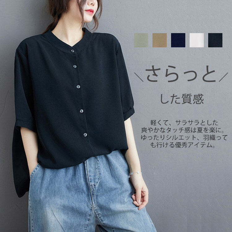 サラサラとしたタッチ感の優れる半袖シャツ ビッグシルエットは体型カバーを叶う シンプルデザイン、普段から通勤まで着れる、ほどよい透け感、羽織れるシャツ