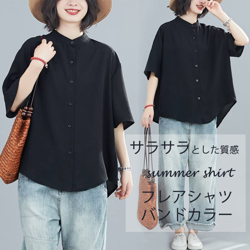 サラサラとしたタッチ感の優れる半袖シャツ ビッグシルエットは体型カバーを叶う カジュアルすぎない大人の抜け感、普段から通勤まで着れる ふんわりフレア涼しいシャツ